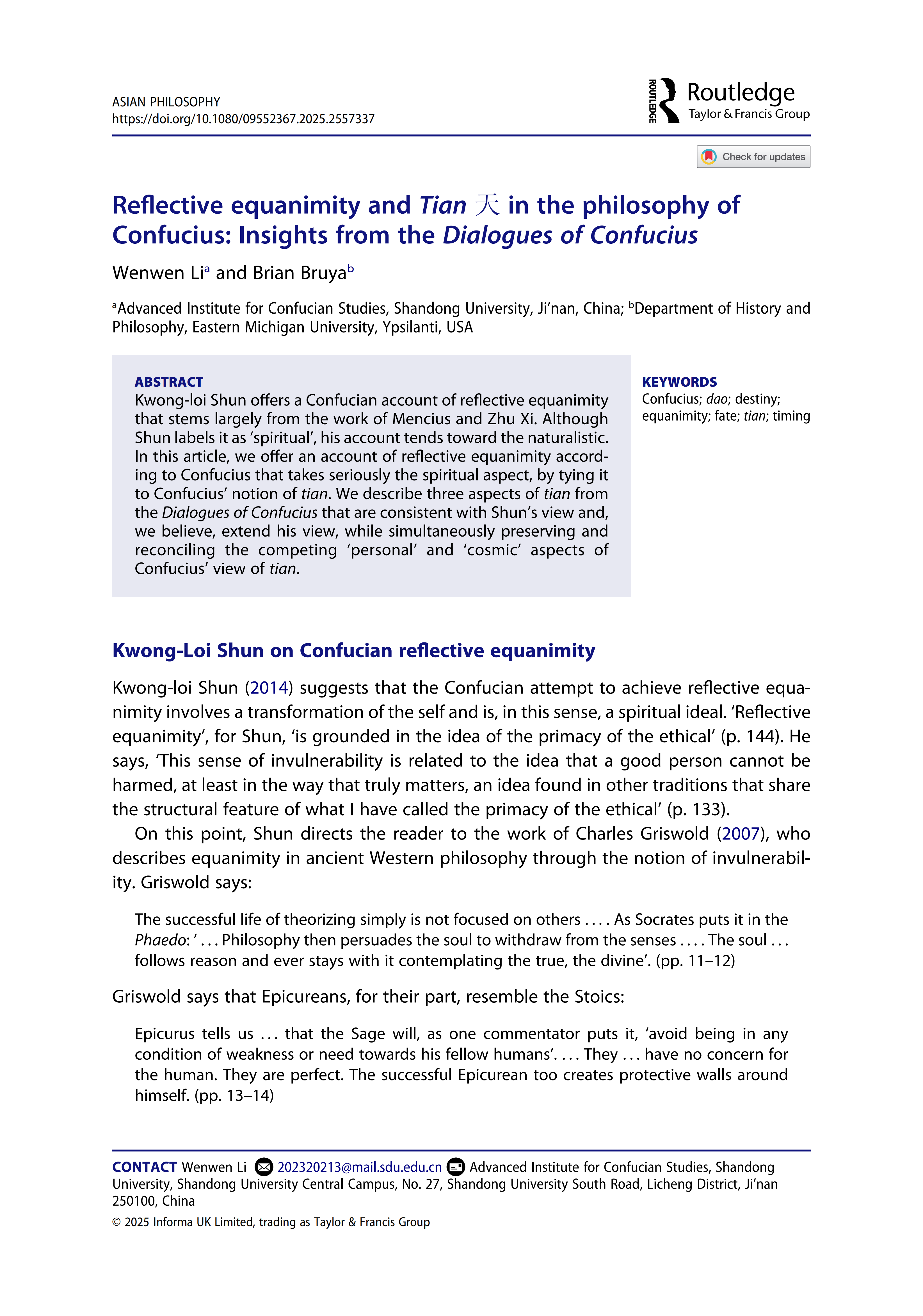 近日,儒学高等研究院中国哲学研究所2023级博士生李文文与Brian Bruya在国际学术期刊Asian Philosophy发表研究论文,题目为“Reflective Equanimity and Tian天 in the Philosophy of Confucius:Insights from the Dialogues of Confucius”(《孔子哲学中的天与反思性平和——来自〈孔子家语〉的洞见》)。李文文为论文第一作者,山东大学儒学高等研究院为第一作者单位。其合作作者Brian Bruya为美国东密歇根大学教授,曾于2018年9月至2019年7月访学儒家文明协同创新中心。