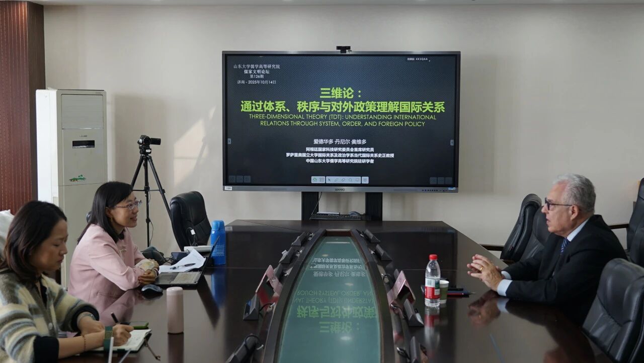 2025年10月14日上午,由山东大学儒学高等研究院、儒家文明省部共建协同创新中心共同举办的“齐鲁访学驻研计划”山东大学专家讲座第七讲暨儒家文明论坛第126期,在山东大学中心校区知新楼A座2106会议室成功举行。阿根廷罗萨里奥国立大学当代国际关系史教授、国家科技研究委员会首席研究员、“齐鲁访学驻研计划”山东大学儒学高等研究院访问学者爱德华多·丹尼尔·奥维多(Eduardo Daniel Oviedo)应邀作题为《三维论:通过体系、秩序与对外政策理解国际关系》的学术讲座,讲座由山东大学政治学与公共管理学院教授李昕蕾主持。