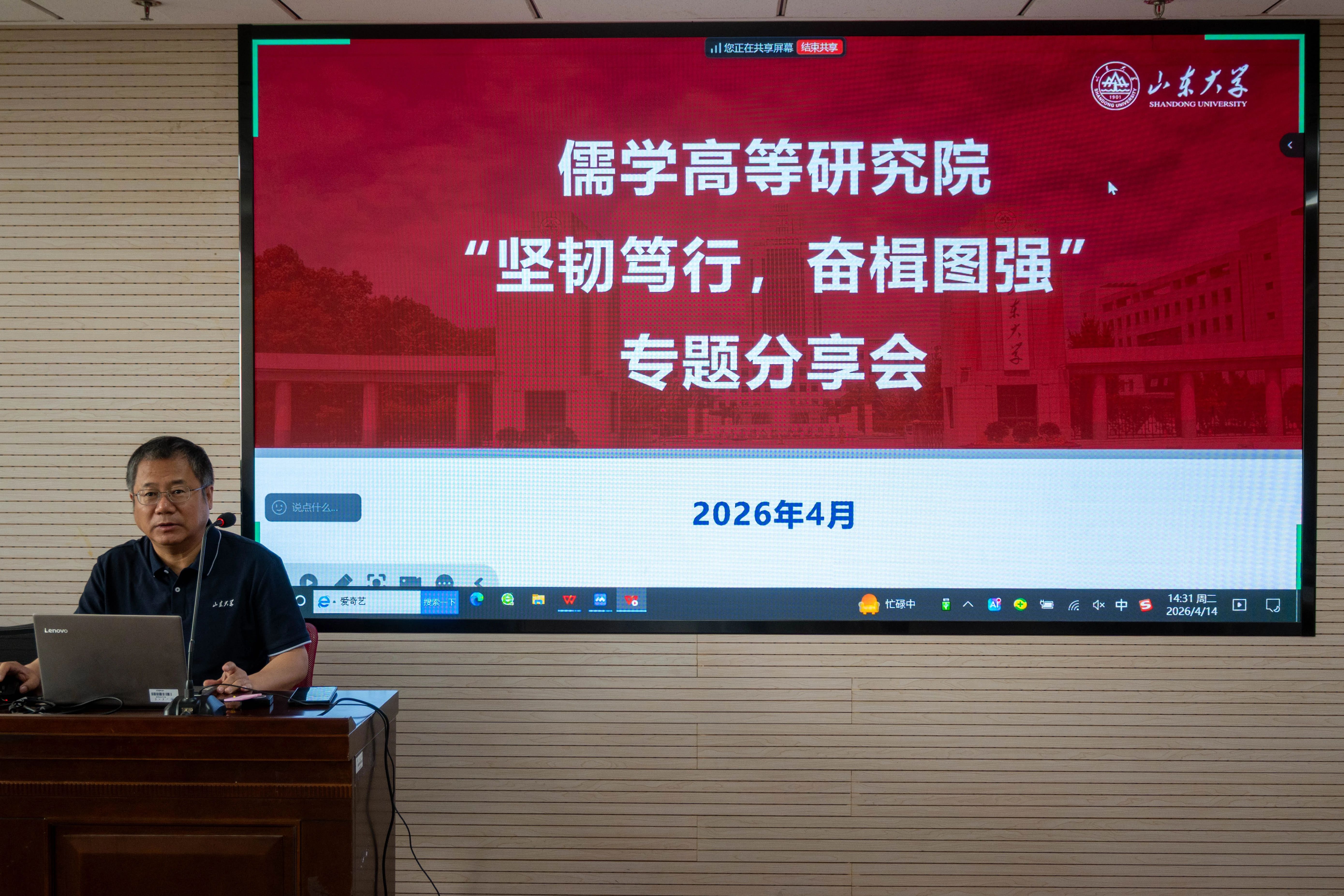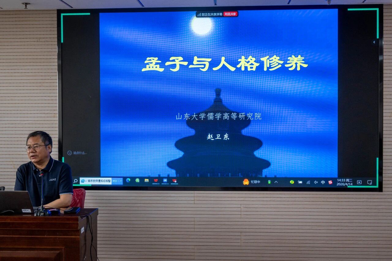 4月14日下午,山东大学第四季“典籍故事名师说”暨儒学高等研究院“坚韧笃行,奋楫图强”主题团日分享会在知新楼A座2116教室顺利举行。本期活动是山东大学党委宣传部、山东大学党委学生工作部、共青团山东大学委员会、山东大学儒学高等研究院共同主办的“典籍故事青年说”“典籍故事名师说”系列活动之一,邀请山东大学儒学高等研究院教授、中国哲学研究所所长赵卫东教授作“孟子与人格修养”学术讲座。讲座由儒学高等研究院副院长徐庆文教授主持。