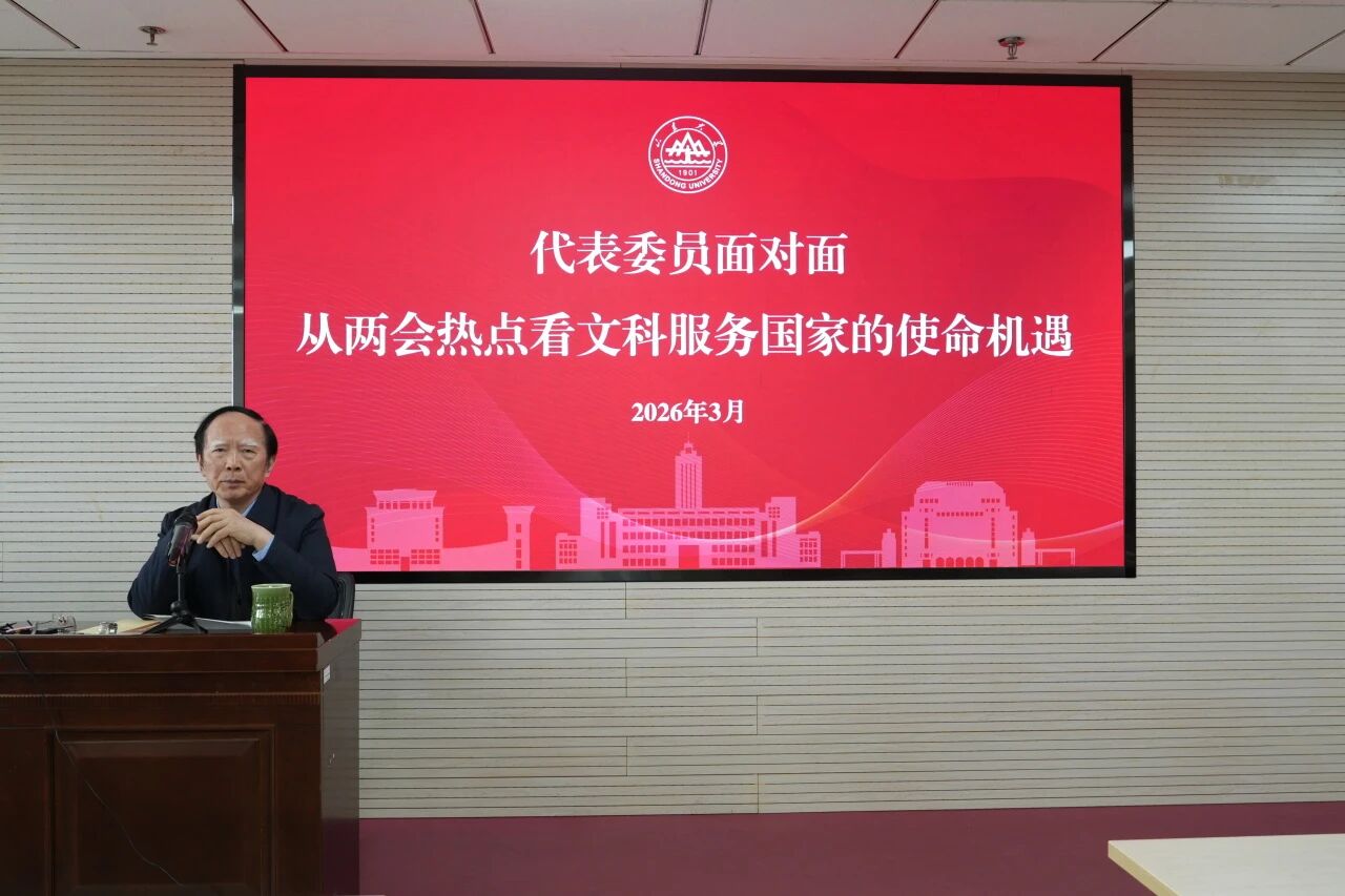 2026年3月12日,儒学高等研究院在知新楼A2116召开“全院师生思政大课暨代表委员面对面主题报告会”。刚刚履职归来的全国政协常委、山东大学儒学高等研究院院长王学典教授为全院师生作题为《从两会热点看文科服务国家的使命机遇》的专题报告,第一时间传达2026年全国两会精神。