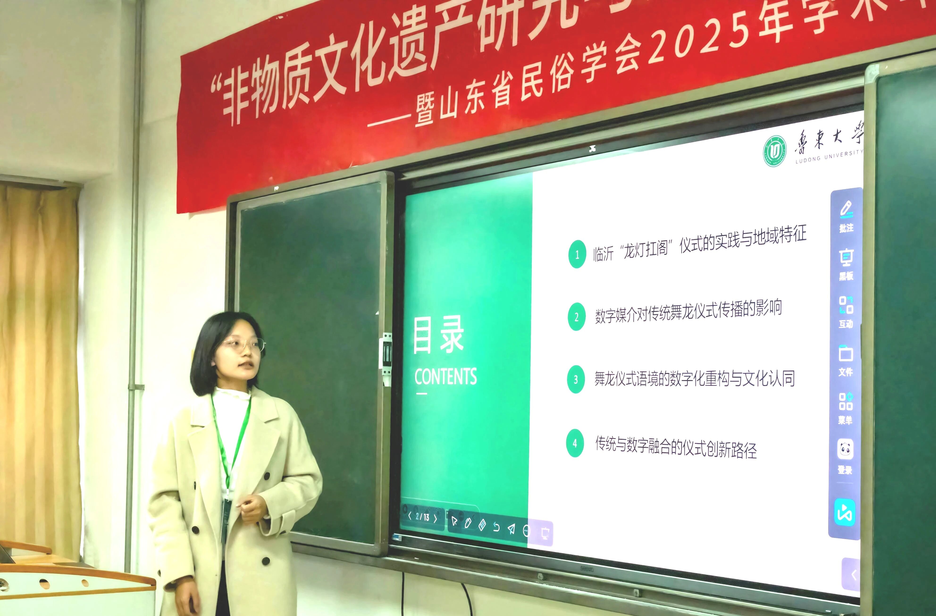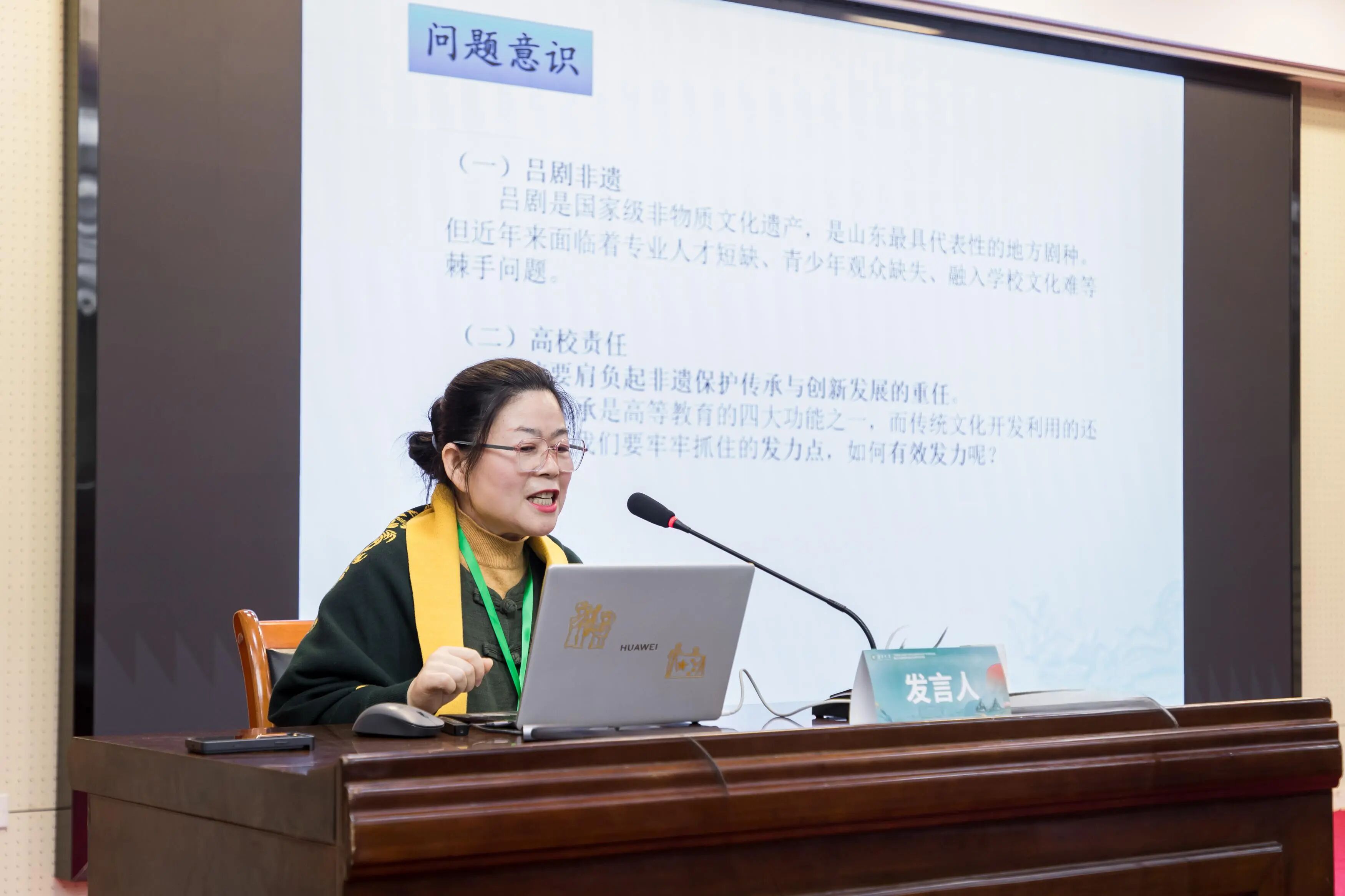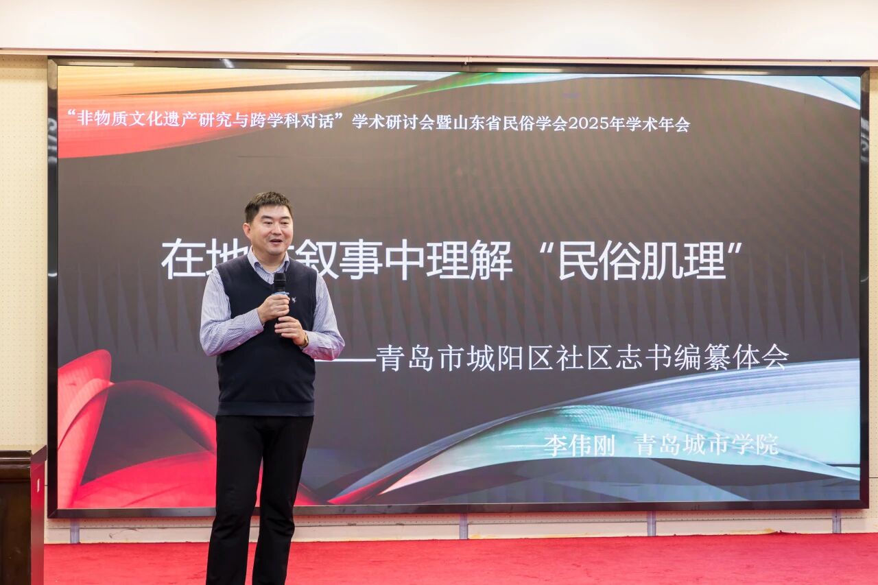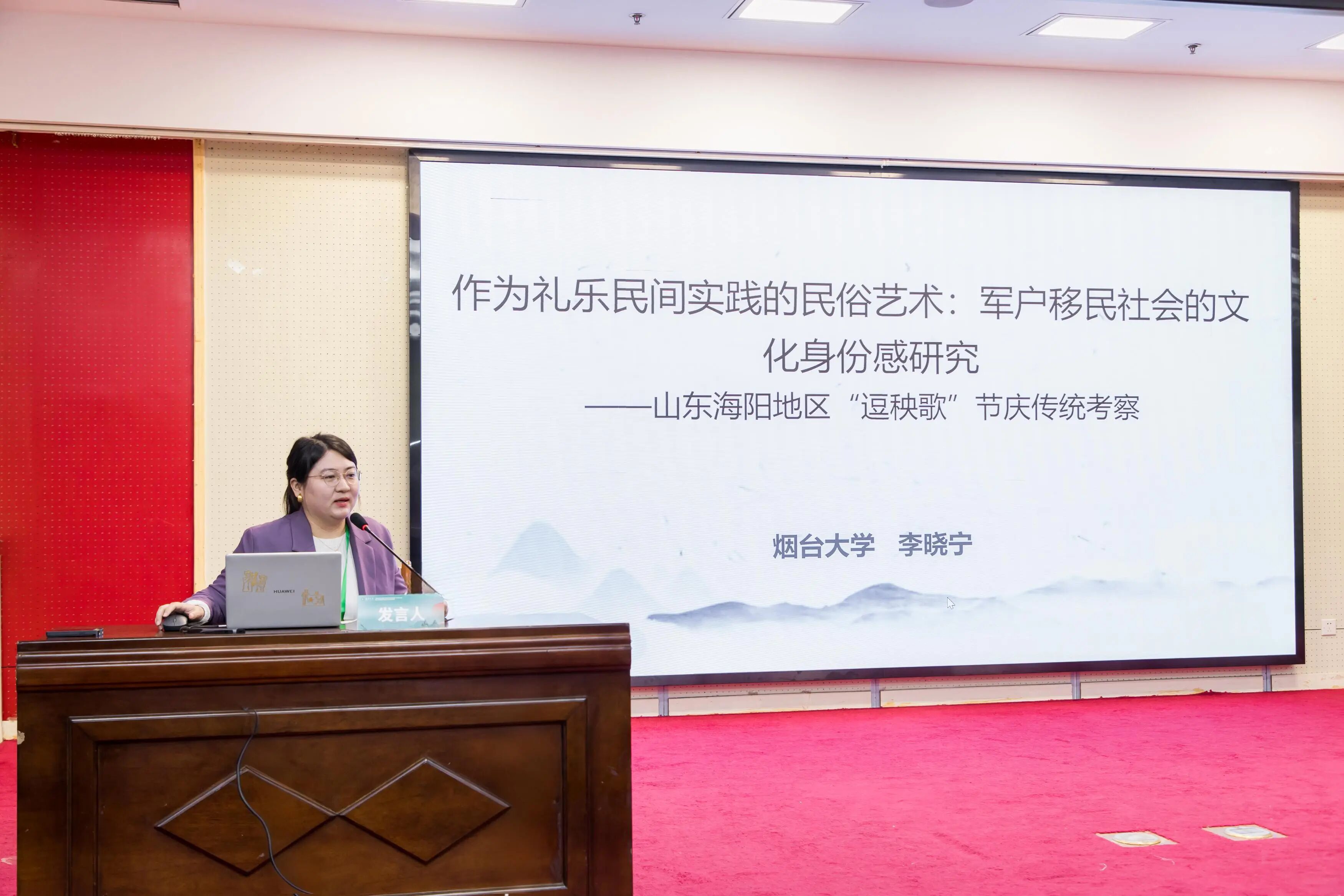 主旨报告环节由鲁东大学艺术学院副院长李文杰主持。青岛城市学院李伟刚以青岛城阳社区志书写为例,提出传统志书需突破官方框架,融入居民口述史、方言习俗等“地方叙事”,构建“有温度、能承载乡愁”的社区传记,实现从“冰冷史料”到“鲜活记忆载体”的转变。山东工艺美术学院毛晓帅基于河南信阳社区调查,指出失地农民通过自身的艺术交流实践解决身份模糊、社交断裂等问题,并借此重构社会秩序。烟台大学李晓宁研究认为烟台海阳大秧歌最初是卫所军户的家宴乐舞,随着卫所制度取消,逐渐演变为军户后代维系自身文化认同的重要纽带。鲁东大学林琳阐释了高校助推地方戏曲创新性发展的三级联动机制,就传统戏曲怎样注入当代生命力问题分享了自己的实践与思考。