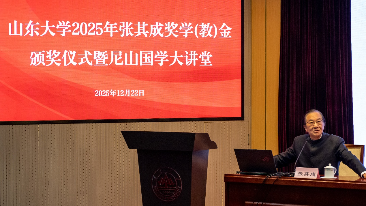 2025年12月22日下午,第五届山东大学张其成奖学(教)金颁奖仪式隆重举行。会后,由山东大学儒学高等研究院主办的“尼山国学大讲堂”第六十六讲在中心校区邵逸夫科学馆报告厅举行。国际儒学联合会副理事长、山东大学兼职讲席教授,北京中医药大学国学院教授张其成应邀作了题为“易道主干:兼论中华文明的精神标识”的学术报告。报告由山东大学儒学高等研究院李平生教授主持。