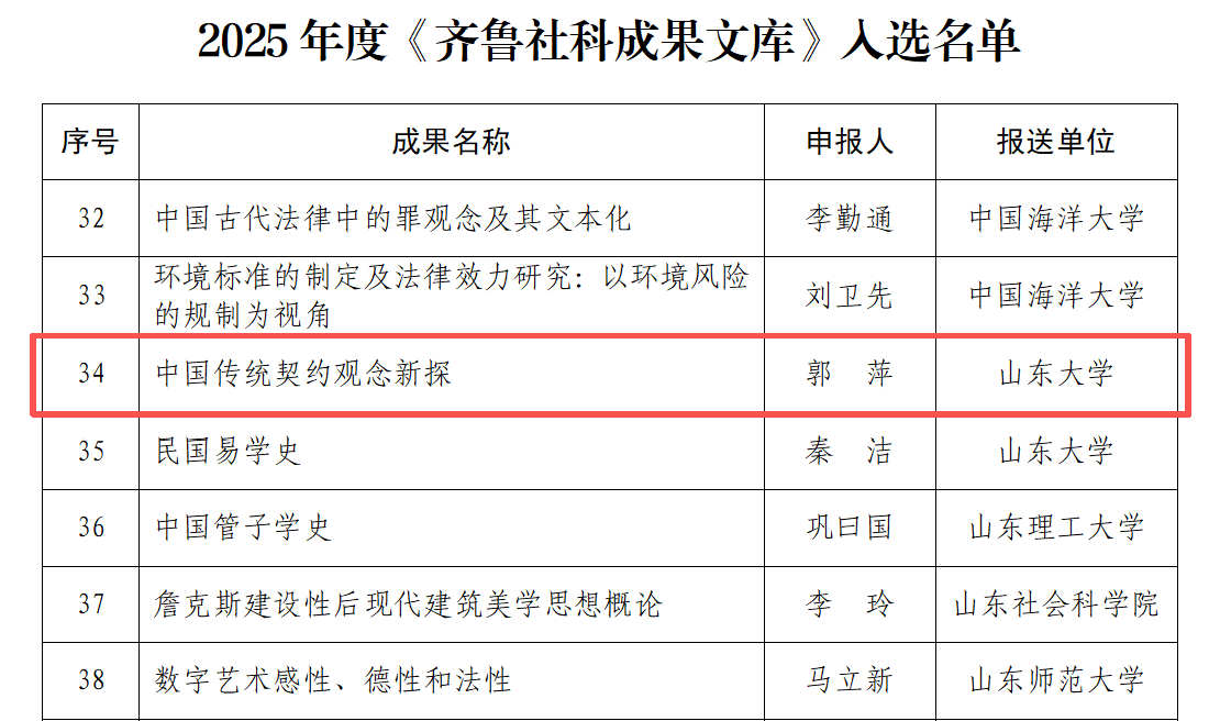 近日,山东省哲学社会科学工作办公室公布了2025年度《齐鲁社科成果文库》入选名单,共有53项成果进入名单。山东大学儒学高等研究院郭萍教授著《中国传统契约观念新探》成功入选。
