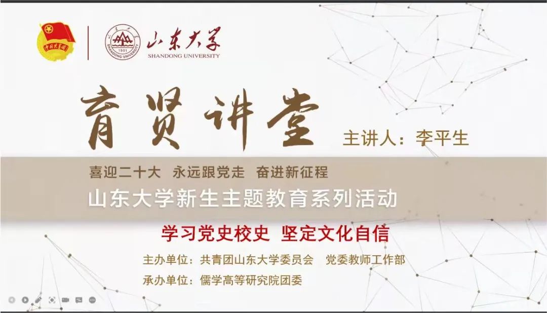 9月13日下午,为增进新生对党史、校史及院史的认识,引导广大新生立足“两个大局”,心怀“国之大者”,争做一流人才,树立对院校的归属感与自信感,更好地适应全新的环境,儒学高等研究院育贤讲堂举办“学习党史校史,坚定文化自信”2022级研究生新生主题教育活动。此次活动通过腾讯会议线上开展,由学院党委书记李平生教授担任主讲人,儒学院2022级全体研究生新生参与。