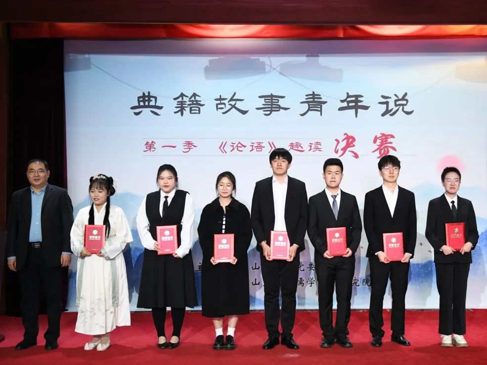 在最后一个节目古雅的旋律中,比赛步入尾声。最终,经由专家评委和学生评委的现场评分,来自儒学高等研究院的张唐宁、姚凯文、颜培森摘得桂冠;来自国际教育学院的张梦瑶团队,儒学高等研究院的李佳杰、李芝瑶获得二等奖;来自文学院的刘哲团队,机械工程学院的李秀忠团队,历史文化学院的党佳怡团队,儒学高等研究院的佟金仪团队、丁世政团队获得三等奖;7名选手获得优秀奖,6个学院获得优秀组织奖。颁奖嘉宾为获奖选手依次颁奖并合影留念,山东大学“典籍故事青年说”第一季《论语》趣读活动圆满落幕。