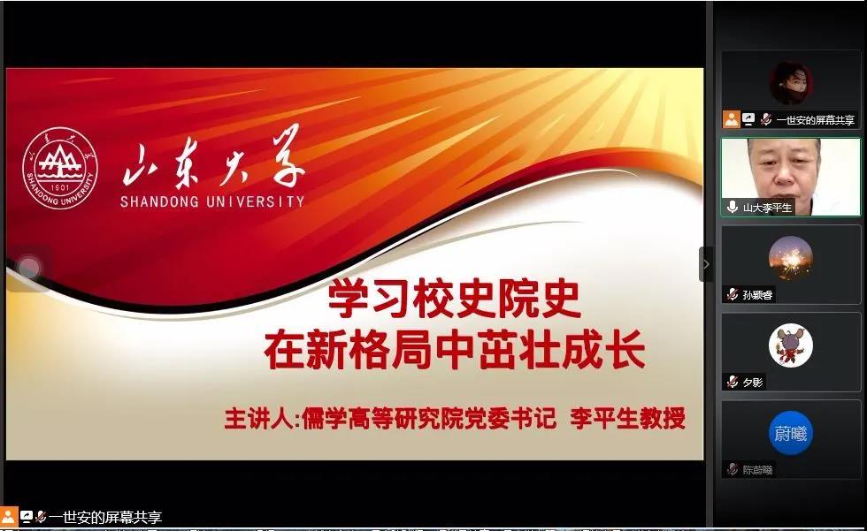 2020年9月17日晚七点,儒学高等研究院新生入学教育系列课程在腾讯会议室如期开展。本次课程的主题是“学习校史院史,在新格局中茁壮成长”,由儒学高等研究院党委书记李平生教授主讲。儒学院党委副书记李鹏程、辅导员王敏老师参加,2020级全体新生聆听了本次课程。