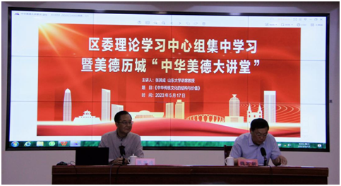 2023年5月17日上午,由历城区、山东大学与山东大学中华文化教育基金联合主办的区委理论学习中心组集中学习暨美德历城“中华美德大讲堂”于历城区机关北三楼会议室隆重举行。全国政协委员、山东大学讲席教授张其成应邀作《中华传统文化的结构与价值》精彩主题演讲。