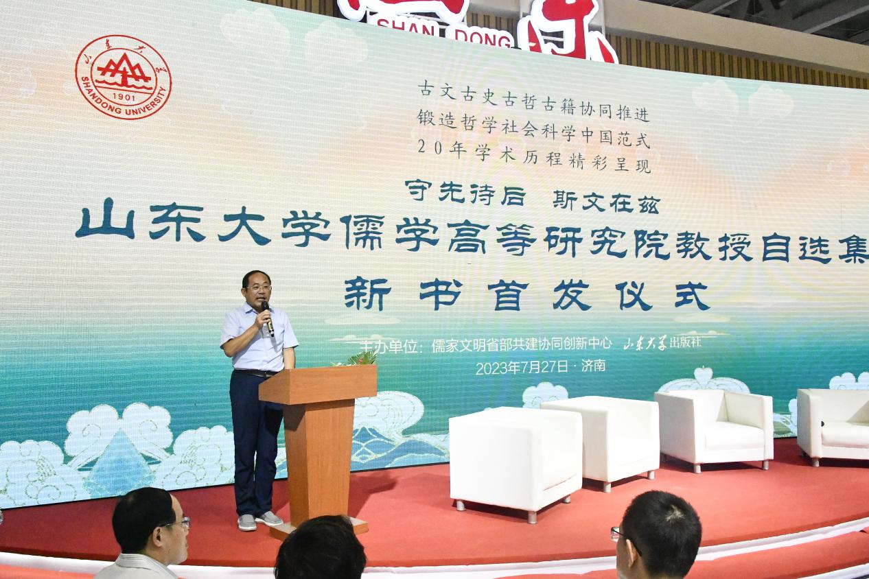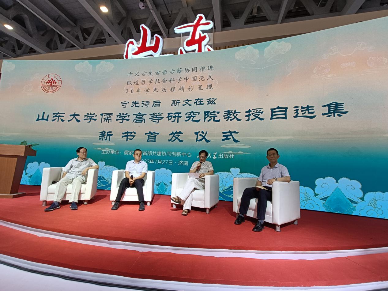 7月27日,“守先待后,斯文在兹——山东大学儒学高等研究院教授自选集”新书发布会亮相第31届全国图书交易博览会。发布会由山东大学出版社副总经理苏立利主持,山东大学出版社社长陈斌致辞,山东大学荣聘教授黄玉顺、山东大学儒学高等研究院教授陈峰、山东大学儒学高等研究院副院长王加华、山东大学儒学高等研究院党委书记王震作为嘉宾参与主题座谈并为新书揭幕。泰山出版社总经理、总编辑魏茂洋、山东省地图出版社社长王菲出席发布会。