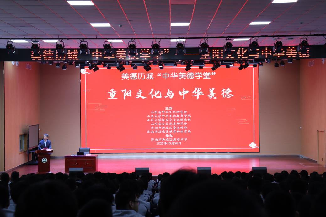 九九重阳福寿长,岁岁安康乐未央。作为中国传统节日之一,重阳节有着悠久的历史,融合了辟邪消灾的民俗、珍爱生命的哲学、天人合一的理念、敬老孝亲的伦理、咏物言志的审美以及时令养生的饮食等多重文化内涵。2025年10月28日上午,为弘扬中华优秀传统文化,发挥节日礼俗的教育教化功能,彰显重阳文化的时代价值,深化校地融合发展,为历城文化强区建设注入活力,山东大学中华美德教育学院联合山东省中华文化研究会、山东大学校友企业家俱乐部、山东省公益慈善研究会、济南市历城区委宣传部、历城区教育和体育局,在历城区唐冶中学举办了“中华美德学堂”重阳节宣讲活动。
