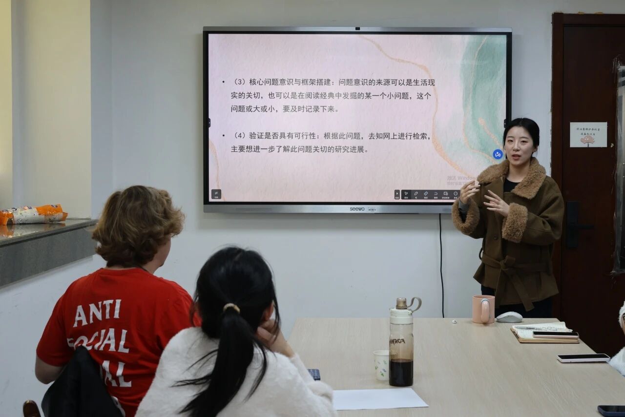 座谈伊始,为加深彼此了解,来自不同文化背景的国际学生们进行了自我介绍。随后同学们结合自身在儒院的学习经历,围绕古文阅读、文献检索、课程跟进等方面展开自由交流并提出相关问题。2023级本科生王一冰同学、2024级硕士王雅荻同学针对大家提出的问题提供了详实的学习建议。