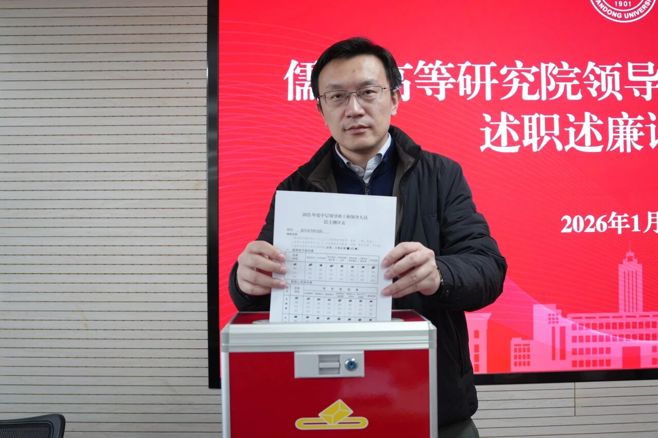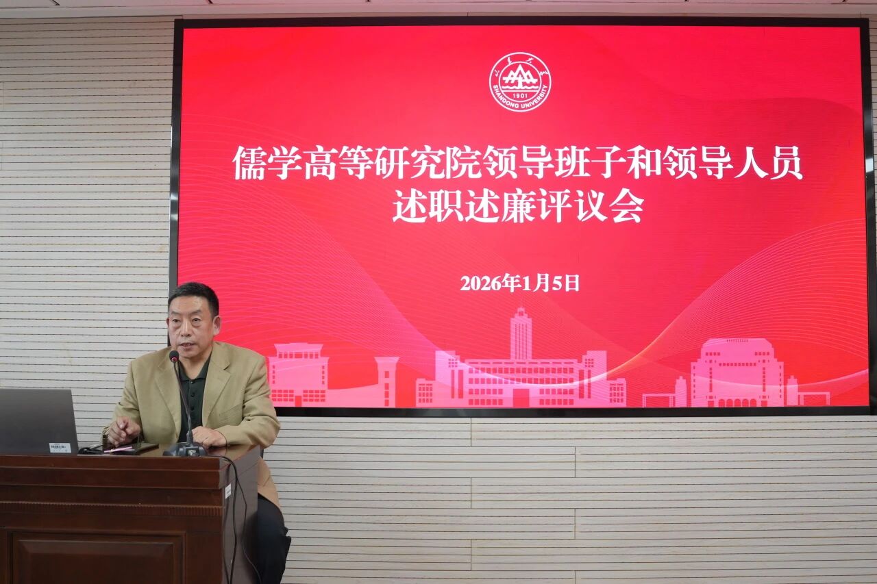 2026年1月5日下午,儒学高等研究院在知新楼A2116召开2025年度领导班子和领导人员述职述廉评议会暨全院教职工大会。院长王学典、院领导班子成员及全体教职工参加了会议。会议由儒学院党委书记、执行院长王加华主持。