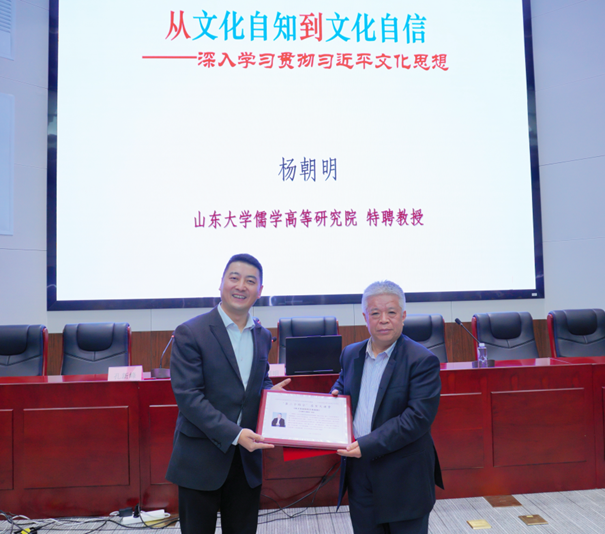 3月26日晚,习近平文化思想研究中心中央民族大学协同研究基地、中央民族大学马克思主义学院主办的“第二个结合”名家大讲堂系列讲座第二讲在京举办。全国人大代表、山东大学儒学高等研究院特聘教授杨朝明应邀以“从文化自知到文化自信”为题作报告。中央民族大学协同研究基地副主任兼秘书长、马克思主义学院党委书记兼院长孔新峰教授主持讲座,并为杨朝明教授颁发特聘研究员聘书。校内外百余名师生聆听了本次讲座。